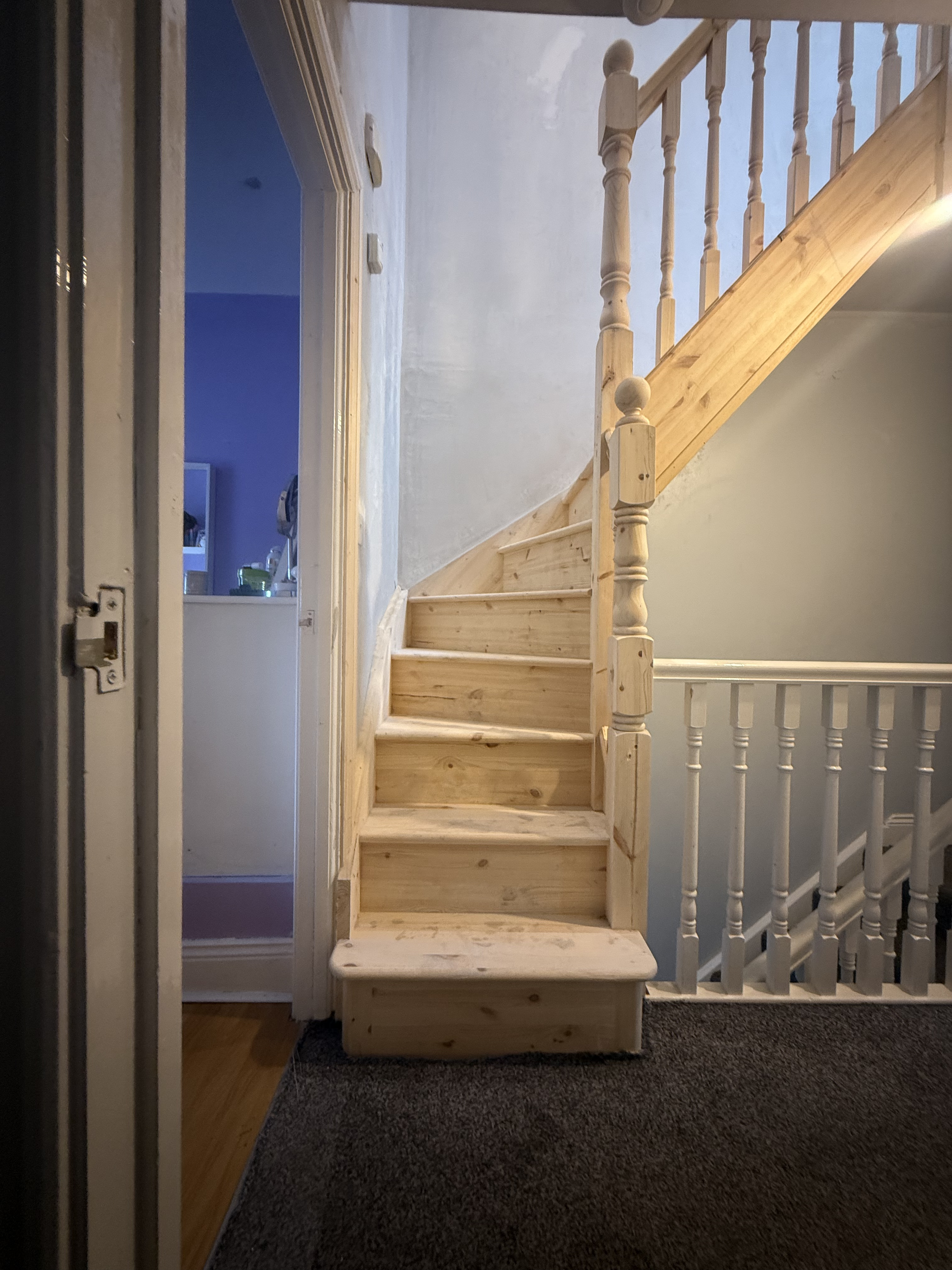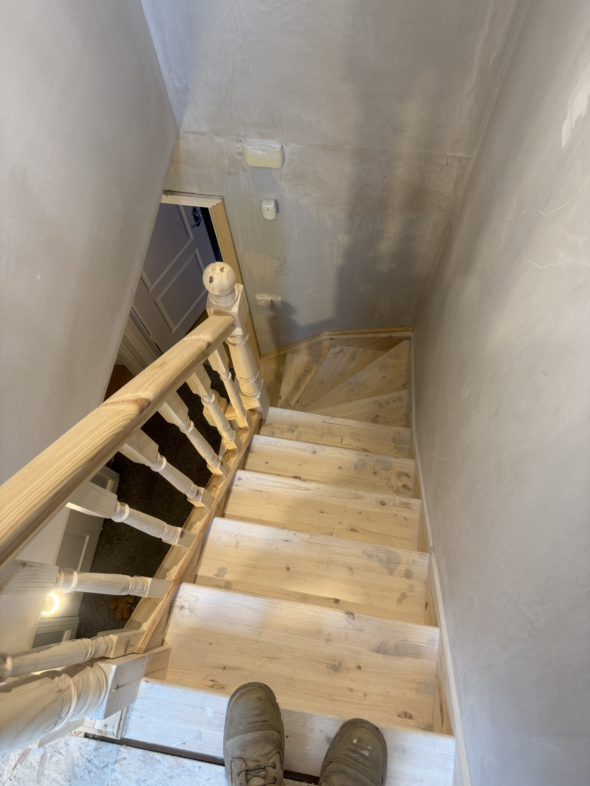 -Compact pine staircase built to blend seamlessly with existing floors.